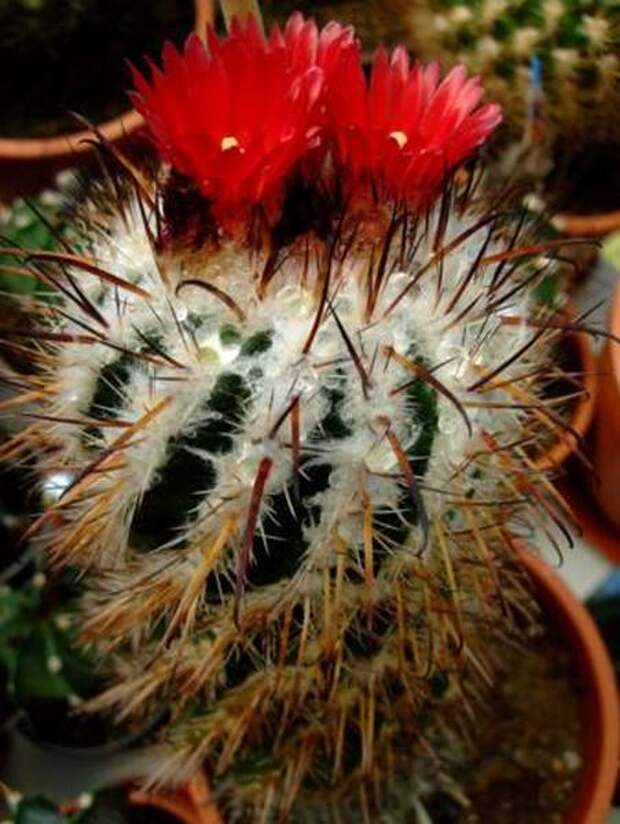 Цветки крупные, 5 см в диаметре, огненно-красные.Пародия Швебса (Parodia schwebsiana) – небольшой кактус с шаровидным стеблем, около 12-14 см в высоту и 10-12 см диаметром. Ареолы расположены по спирали, снизу опушение незначительное, а постепенно к верхушке становится больше. Колючки крупные, их около 10 штук по 1 см и 4 центральных по 2 см длиной. Самая толстая и темная центральная колючка загибается на конце. Цветки не крупные, ярко-красные.